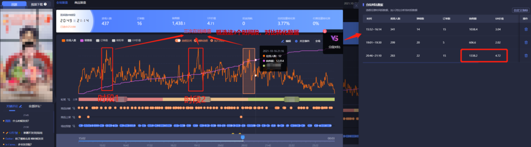 通过飞瓜智投的【全场复盘】中的分段功能,可以看到下面这个直播间,场观相同的情况下,时段3的UV价值最高,说明这个话术的转化能力最强。