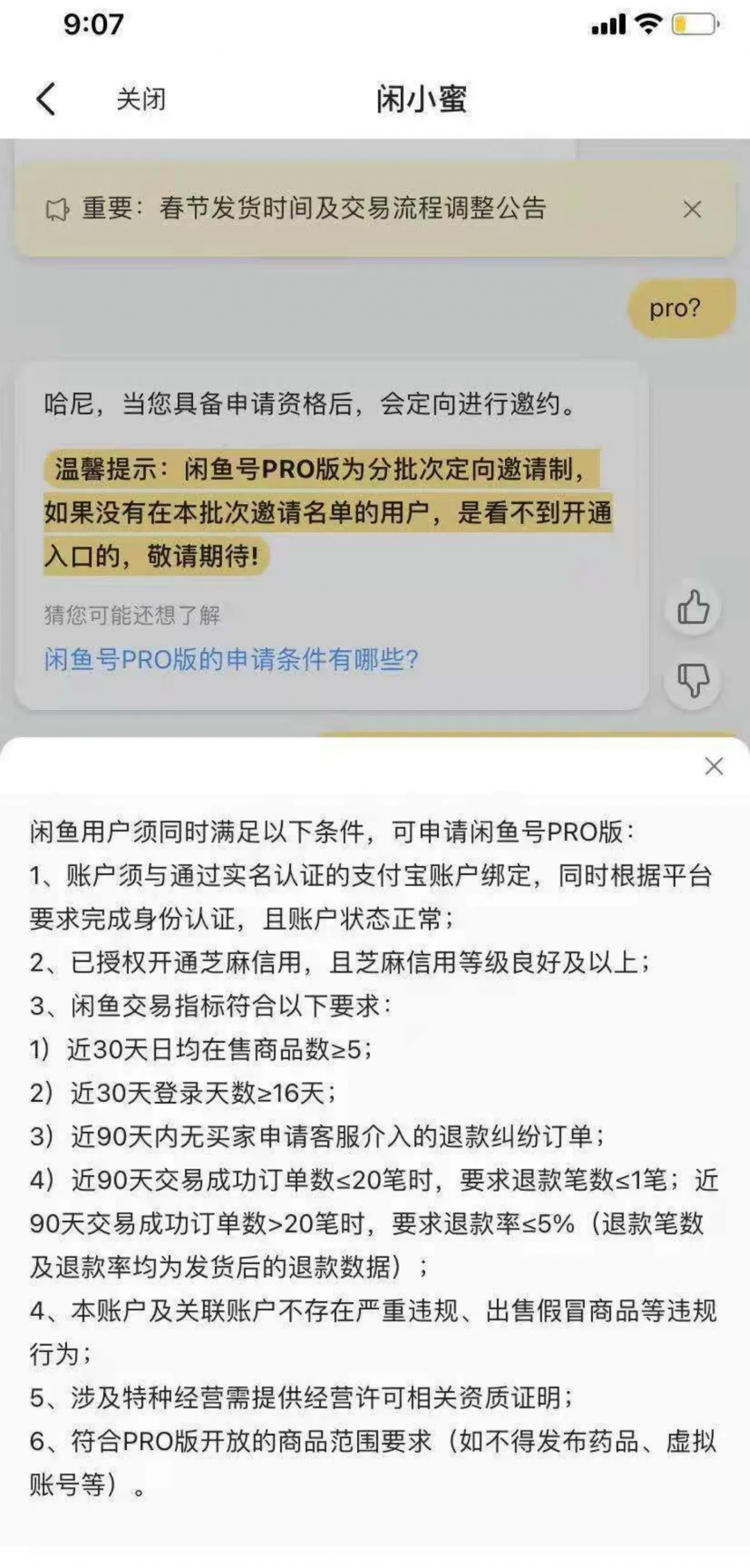 但事实却证明了,不符合条件的也一样能开通。很多人发了没几个商品,很多人违规在小黑屋期间也能收到PRO邀请,可见平台规定有很大弹性空间。关于PRO的开通,佛性一点看缘分就可以了,不要找人花钱开,他们多数是想利用这点来骗你钱的。