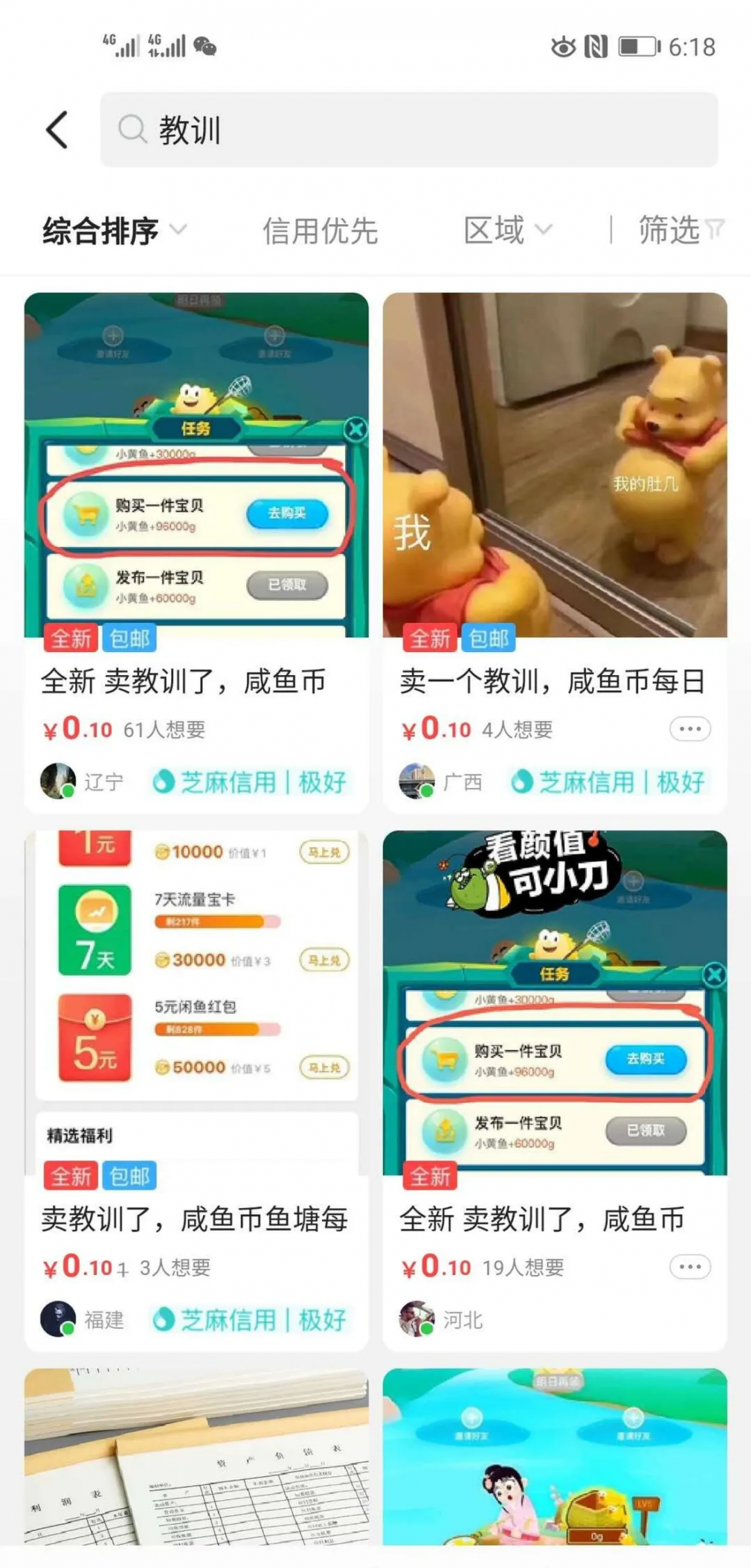 不懂行的人只会觉得这是沙雕卖家开的玩笑,但是你现在在闲鱼搜「教训」,就会看见琳琅满目的一分钱「教训」,销量还都不错。
