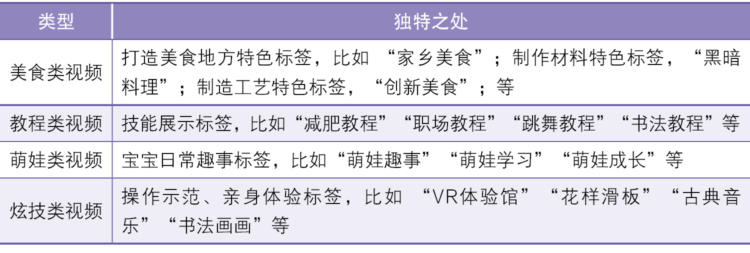 那么,如何利用稀缺感找到自己的独特标签呢?下面,我们将结合常见的视频类型列举一些寻找独特标签的技巧和方法,具体如表所列。