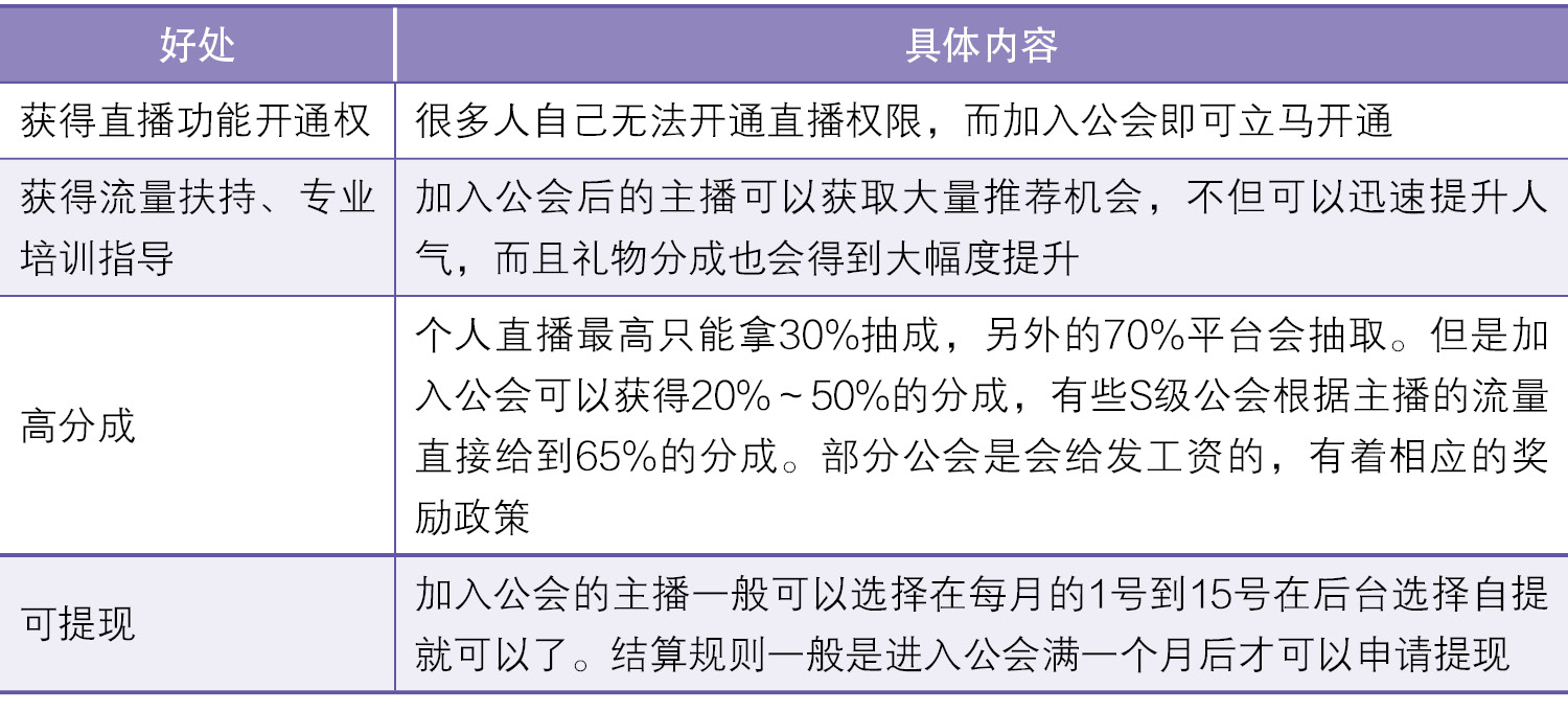 抖音公会是一个为主播提供资源扶持的组织,加入公会后,会获得很多好处,比如流量扶持、热门推荐、专业培训指导等,具体如表所列。